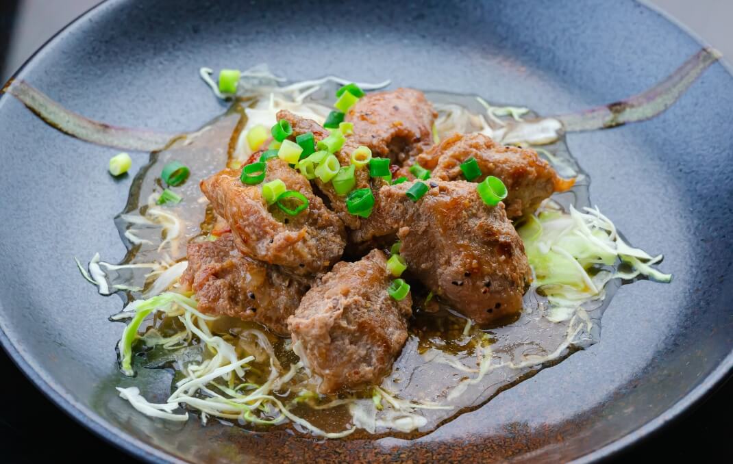 おすすめは姶良のソウルフードである「あご肉」。豚のこめかみの肉をニンニクでしっかり味付けしたもので、摘出の難しく希少な部位を美味しく食べられるようにと、試行錯誤の末に生まれた食材です。コリコリとした歯応えは他の何とも違う、不思議な食感。姶良を訪れるのならぜひ味わっていただきたい一品です。